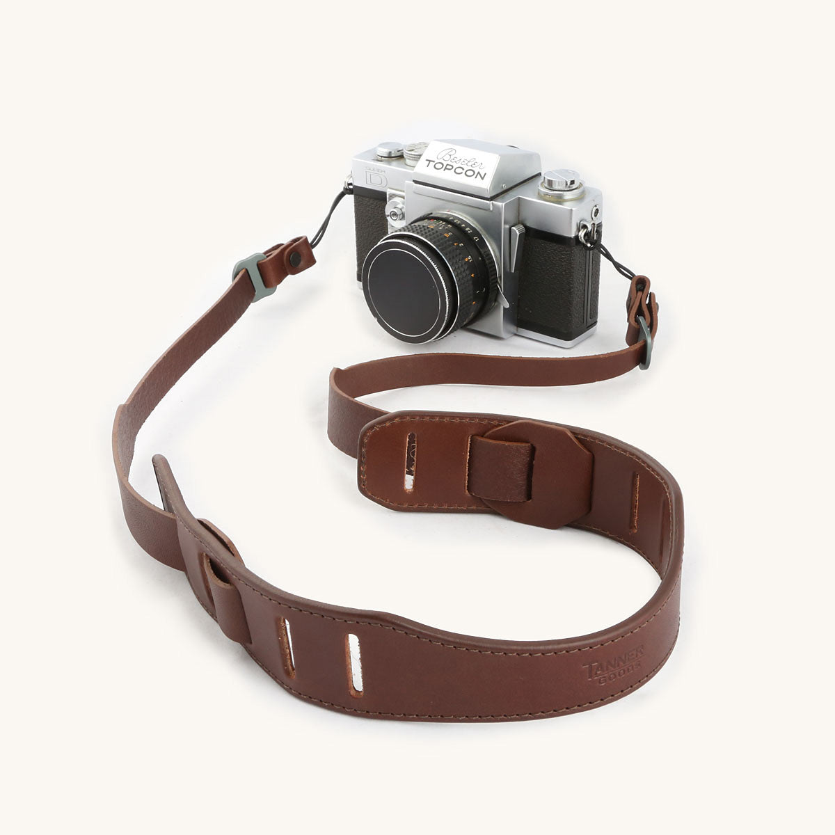 Constructed from a combination of 3.5 and 5.5 oz. vegetable-tanned Meridian English bridle leather, the SLR Camera Strap attaches to your camera with two high-density nylon cords. Each is burnished, dyed, waxed, and stamped with our signature maker's mark.