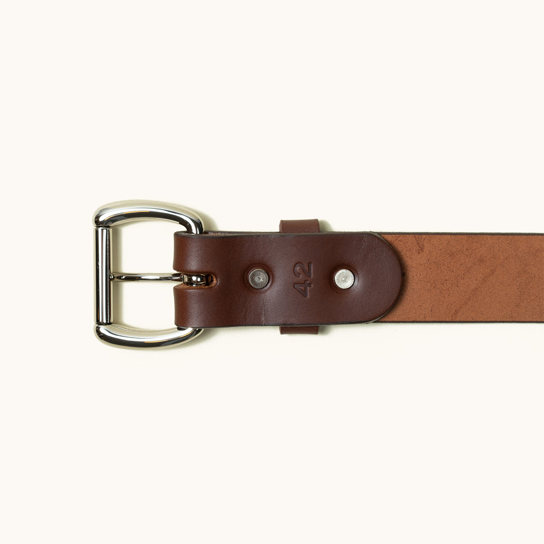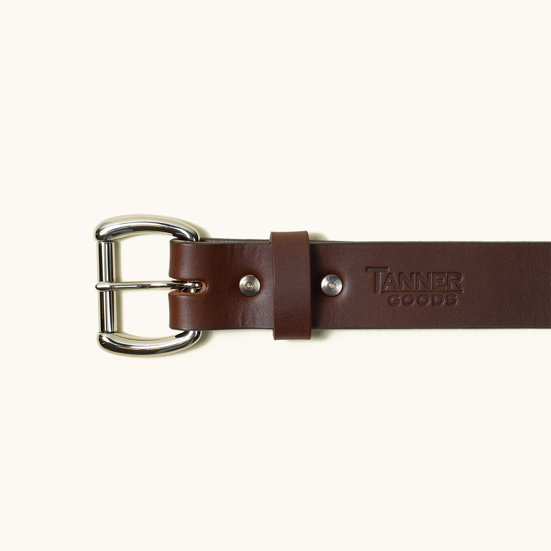 Tanner Goods leather belts come in a variety of width, color, sizing and buckle options. Our belt sizing corresponds to the length between the turn of the buckle and the first hole closest to the buckle. For instance, a Tanner Goods size 34 belt is 34” from the belt fold to the first hole.