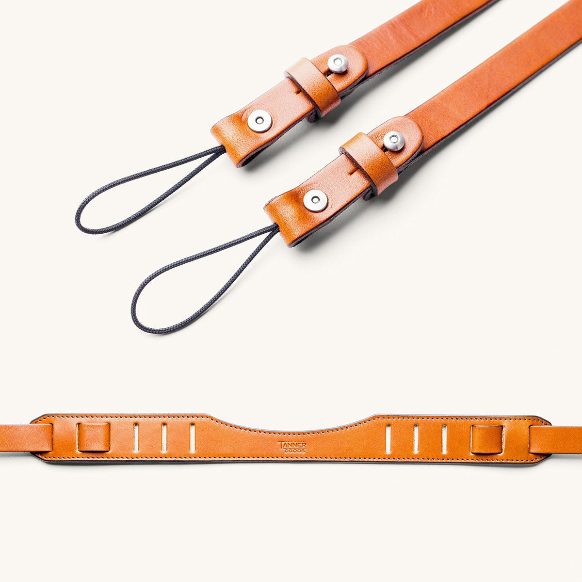 Constructed from a combination of 3.5 and 5.5 oz. vegetable-tanned Meridian English bridle leather, the SLR Camera Strap attaches to your camera with two high-density nylon cords. Each is burnished, dyed, waxed, and stamped with our signature maker's mark.