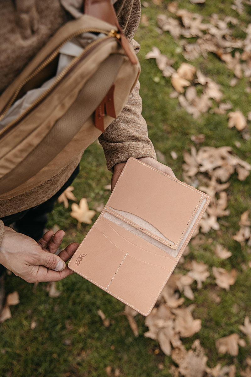 Constructed from 3.5 oz. vegetable tanned Meridian English Bridle leather, our Travel Wallet is thin yet robust in feel. Each wallet is burnished, dyed, waxed, and stamped with our signature maker's mark.