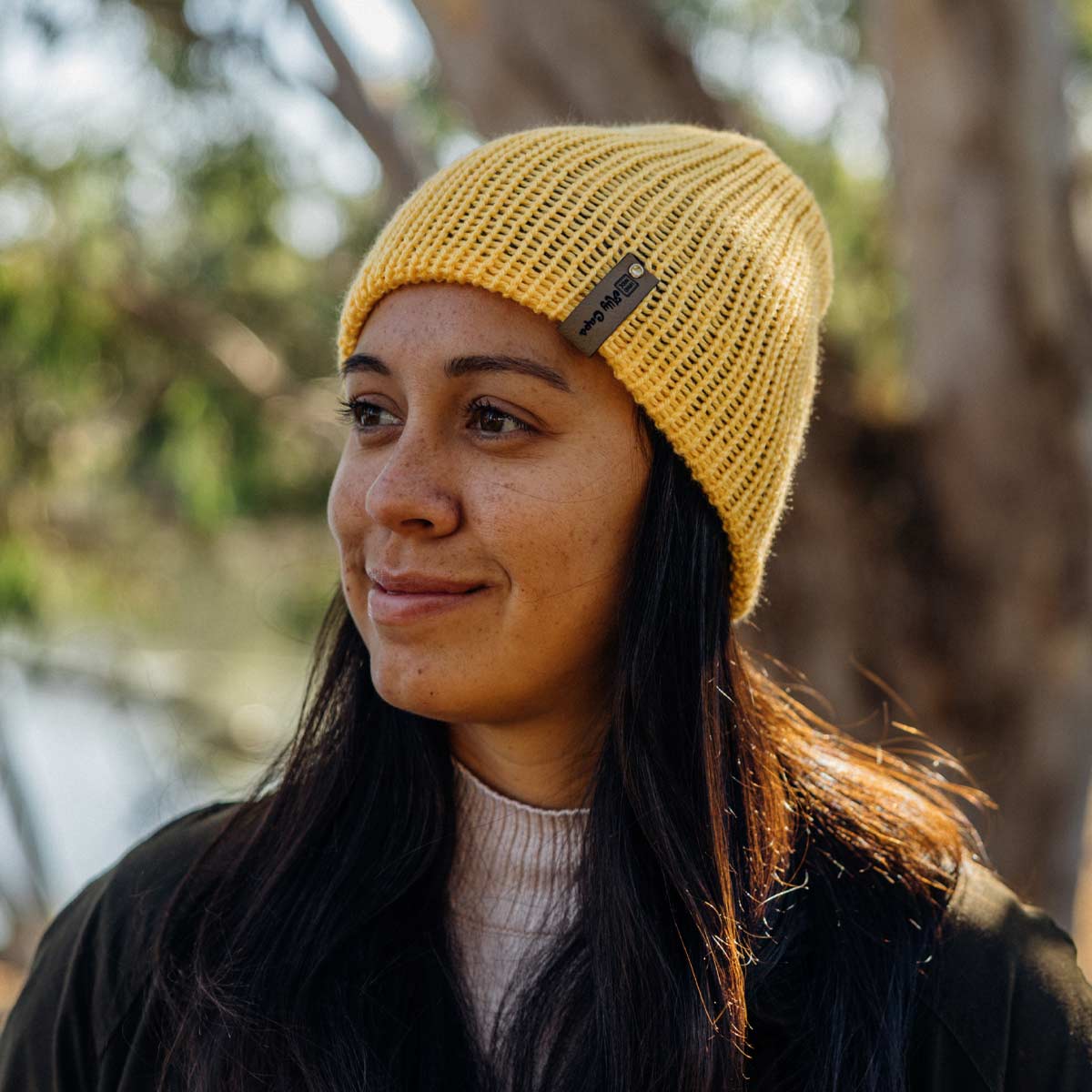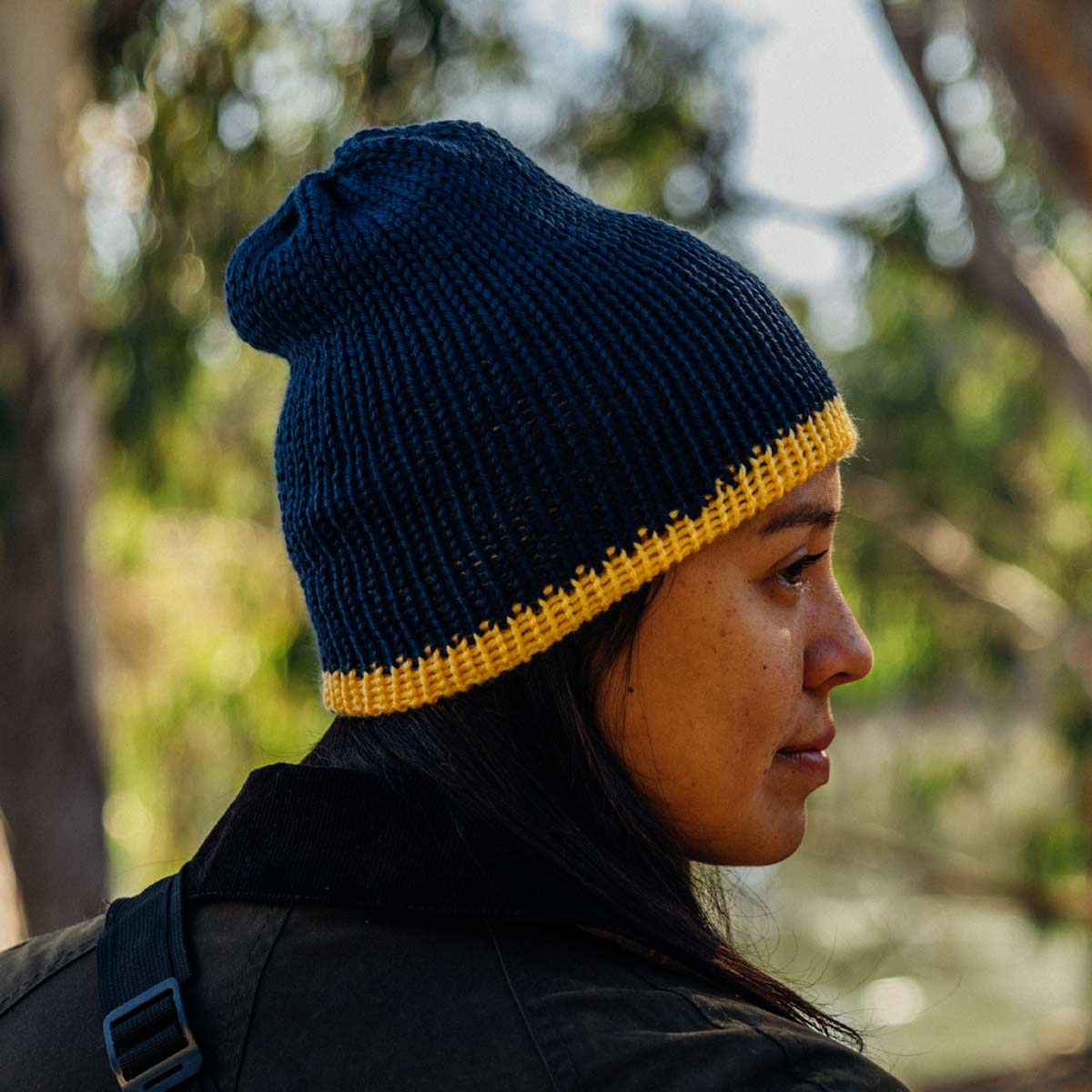 Add some brightness to your wardrobe with our reversible beanie! This soft and cozy 100% acrylic hat is handmade in the Oregon by a local artist and comes in beautiful blue and yellow. It's sure to become your go-to for effortless style!